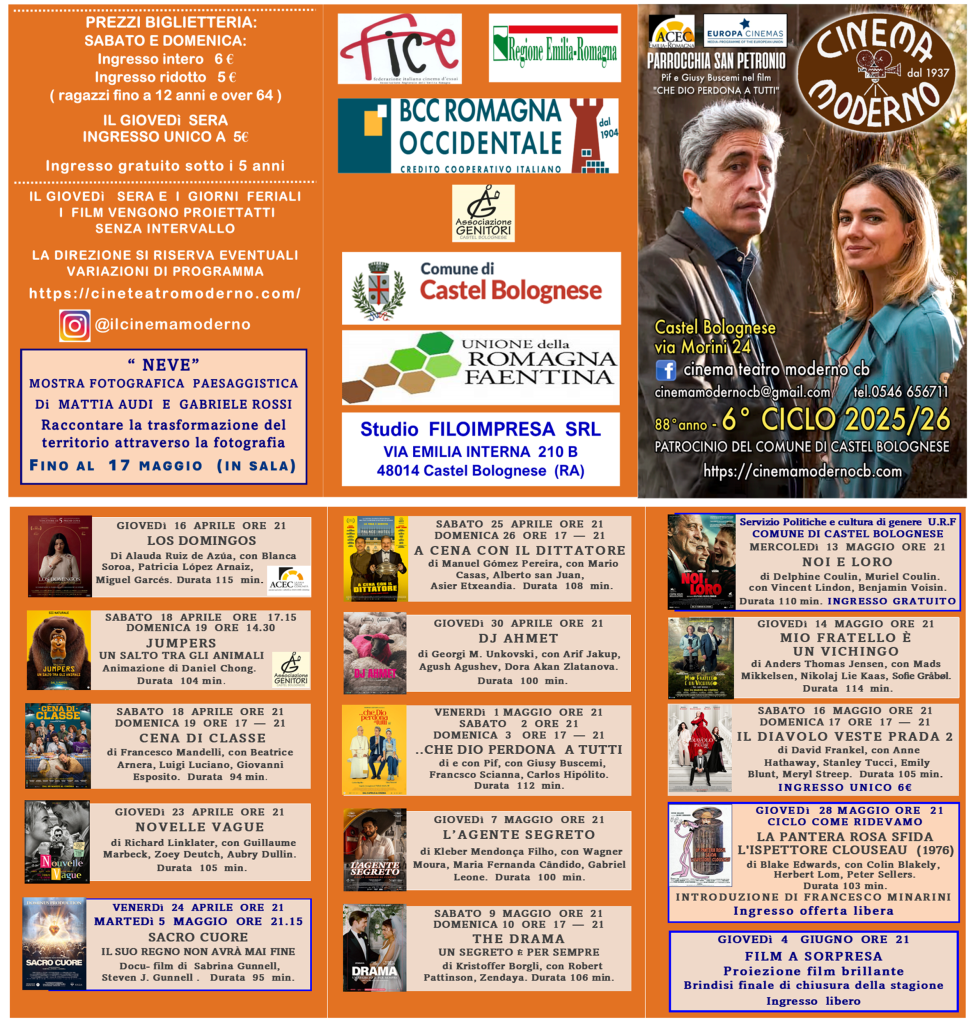 Il Cinema Teatro Moderno di Castel Bolognese è una delle sale cinematografiche parrocchiali più longeve sul territorio nazionale. La sala opera ininterrottamente dal 1937 grazie al lavoro fondamentale dei suoi volontari e rappresenta uno dei più significativi luoghi culturali della cittadina.